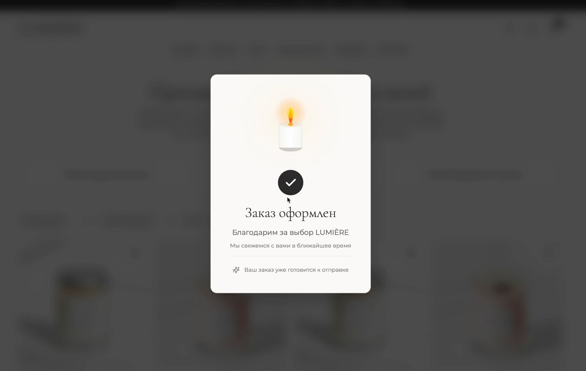 Чтобы не было скучно, я попросил Юру сделать отдельное окно с анимацией горения свечи, когда заказ оформлен. Получилось блекло, поэтому сразу же попросил сделать анимацию красивее — более люксовую. И он сделал.