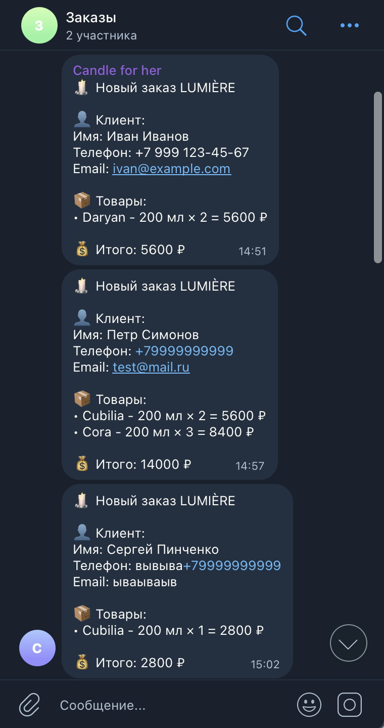 Теперь при каждом заказе бот присылает сообщение в группу: